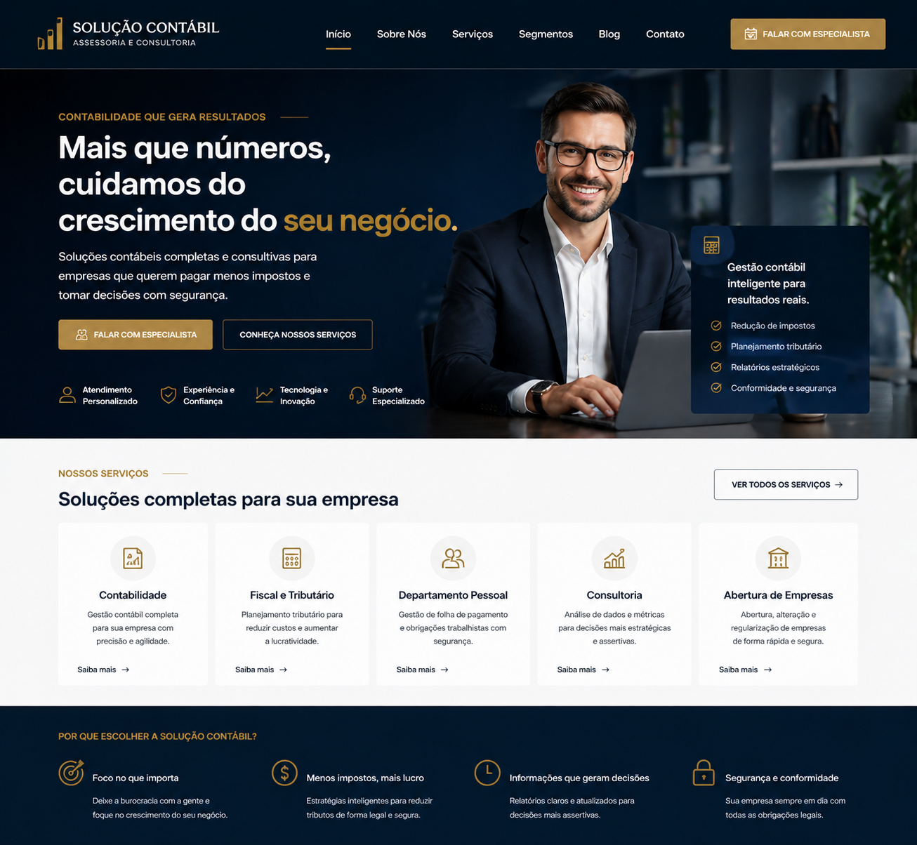 Site Institucional robusto com até 5 páginas (como Home, Sobre, Serviços e Contato).
